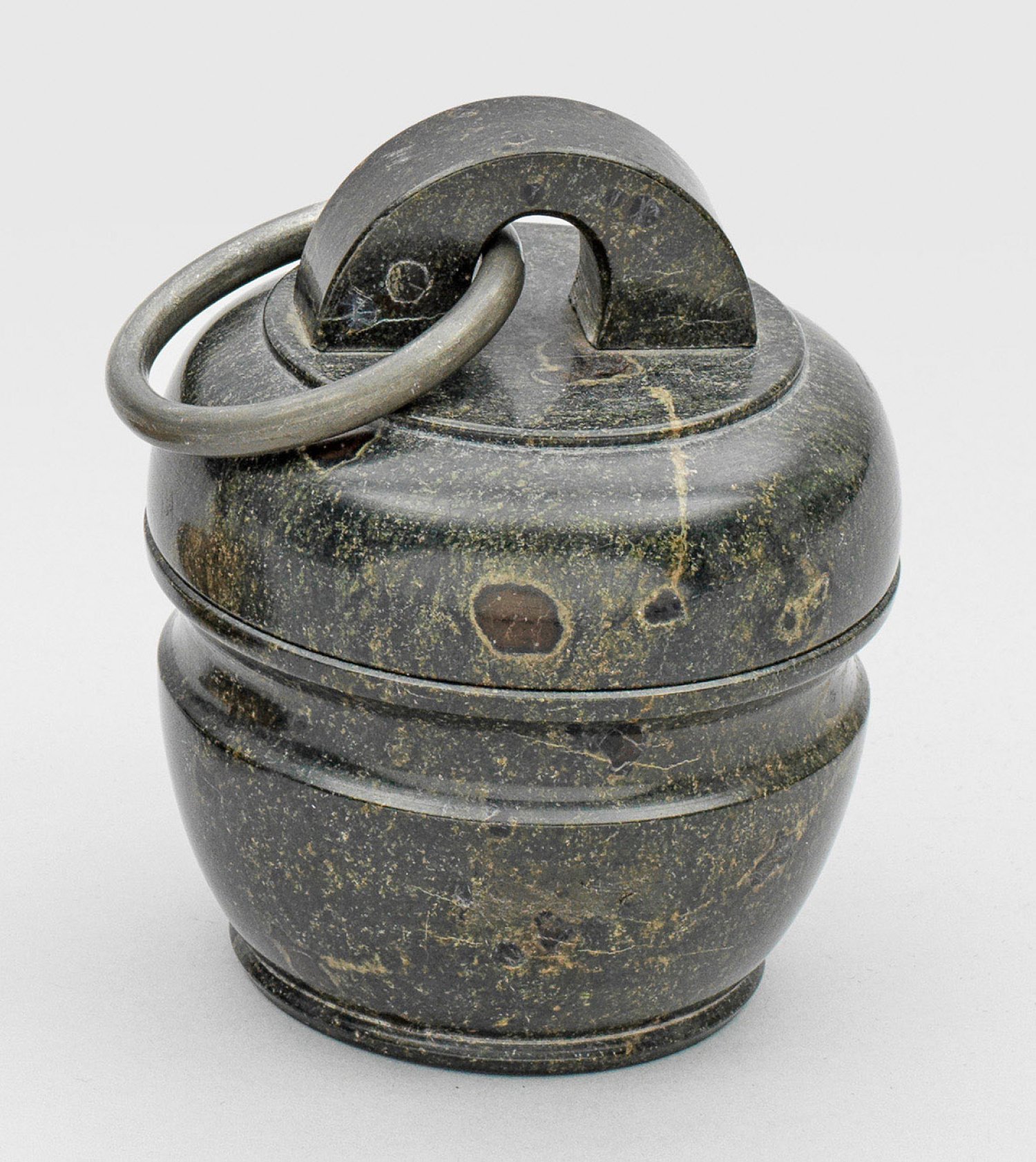 Schwarz gemaserter, dunkelgrüner Serpentin. Urnenförmiger, sich nach oben hin erweiternder, mittig gekehlter Korpus mit aufgewölbtem, gerundetem Schraubdeckel und halbrundem Ringgriff mit montiertem Zinnring. H. 11,3 cm. D. 9,2 cm.