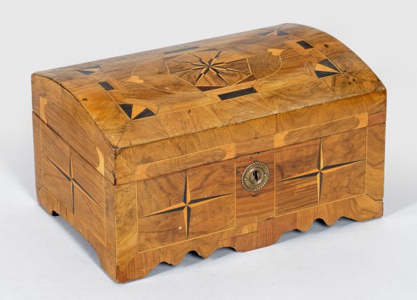 Nussbaum, furniert. Gerader, querrechteckig angelegter Korpus auf passig geschweifter, gesägter Zarge. Aufklappbarer, flach gewölbter Deckel mit zentraler Sternintarsie. Flächendeckend breit gerahmte Furnierfelder, von Fadeneinlagen begrenzt. Innen sog. Hohe Kante mit Geheimfach. H. 16 cm. 29 cm x 18,5 cm.