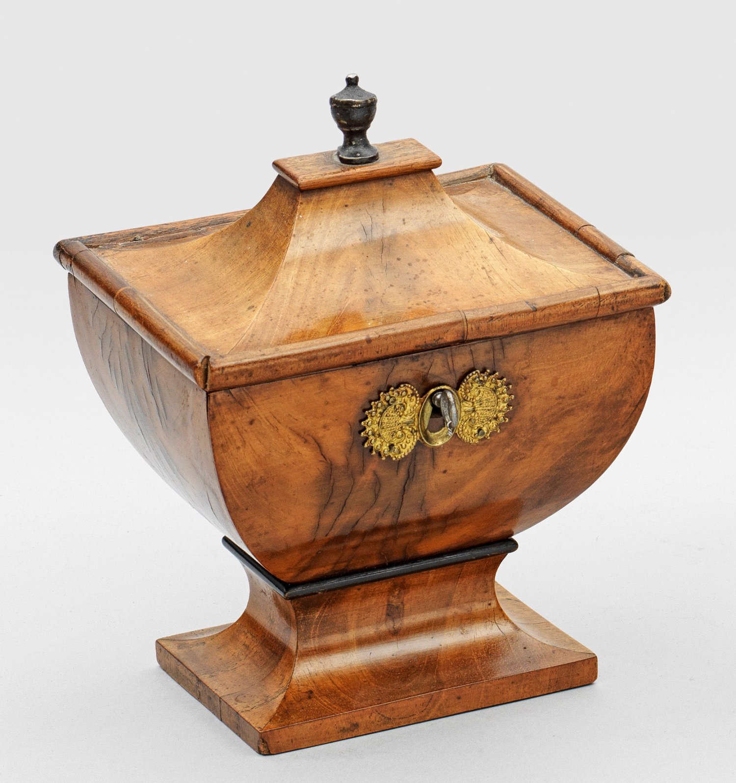 Mahagoni, teilw. ebonisiert. Über rechteckigem, geschweift ansteigendem Sockel korrespondierender, allseitig bombierter Korpus mit reliefiertem Schlüsselschild aus Messing. Profilgerahmter, geschweift ansteigender Deckel mit geschwärzter Balusterbekrönung aus Zinn. H. 21 cm. 16 cm x 13 cm.