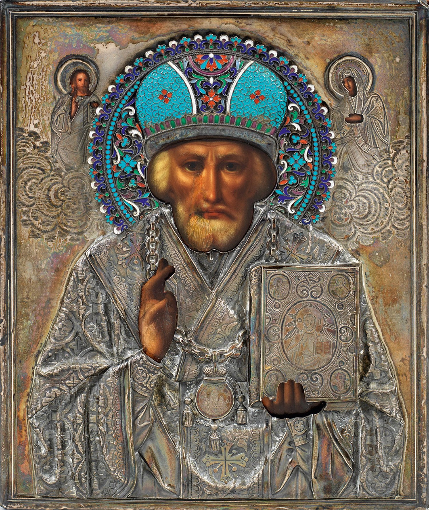 Polychrome Malerei auf Holz. Halbfigurige Darstellung des Heiligen Nikolaus der Wundertäter im Bischofsornat mit Evangelium in der linken Hand, die Rechte zum Segensgestus erhoben. Oberhalb flankiert von Christus und der Gottesmutter. Reliefplastisch gearbeiteter, reich verzierter Silberoklad, Nimbus mit Cloisonné-Email. Kokoshnik-Marke, Gest. 84 Zolotniki, Meistermarke "EK" wohl Erik (August) Kollin, St. Petersburg. Minim. rest.; Oklad minim. besch.; Rücks. samtbezogen. 32 cm x 27 cm.