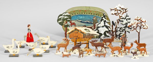 27-tlg.; Holz, polychrom bemalt. U.a. Förster, verschneite Futterstelle mit unterschiedlichen Rehen und Hirschen sowie verschneiten Bäumen und Tannen mit Spanschachtel bzw. Gänsemagd mit Gänseschar. Dazu zwei Massehunde. Entw. August Geigenberger. Um 1903. H. 5 cm - 30 cm.