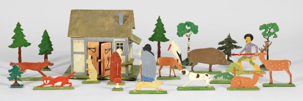 23-tlg.; Holz, polychrom bemalt. U.a. Waldhütte, Hexe mit Katze, Jäger, Jagdhund, Wildschwein, Wolf, Fuchs, zwei Hasen, Hirschkuh, Hirsch, Reh und Storch sowie unterschiedliche Bäume und Tannen. Entw. Hellmuth Eichrodt, um 1902. H. 5 cm - 25,5 cm.