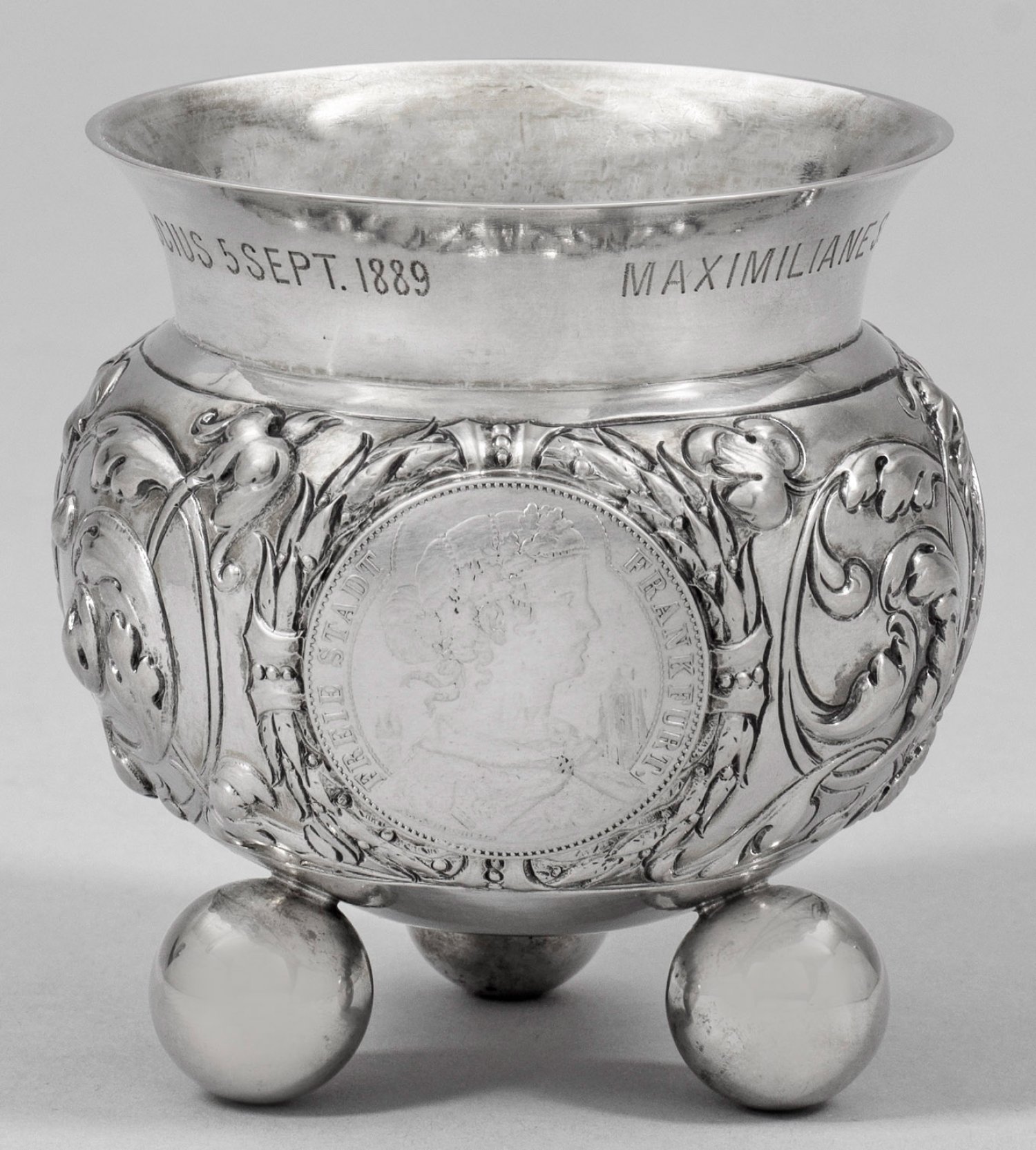 Silber. Über drei Kugelfüßen gedrückt bauchiger Korpus mit abgesetzter Schulter und sich konisch erweiterndem, glattem Rand. Die Wandung üppig verziert mit reliefplastischem Blattwerk zwischen drei eingelassenen, von Lorbeerkränzen gerahmten Münzen- ein Vereinstaler der freien Stadt Frankfurt von 1857, ein Doppelgulden sowie ein Gedenktaler der freien Stadt Frankfurt zum 100. Geburtstag von Johann Wolfgang von Goethe 1849 bzw. von Friedrich Schiller 1859. Innen vergoldet. Gest. 13 Lot. Gew. ca. 145 g. H. 8 cm.