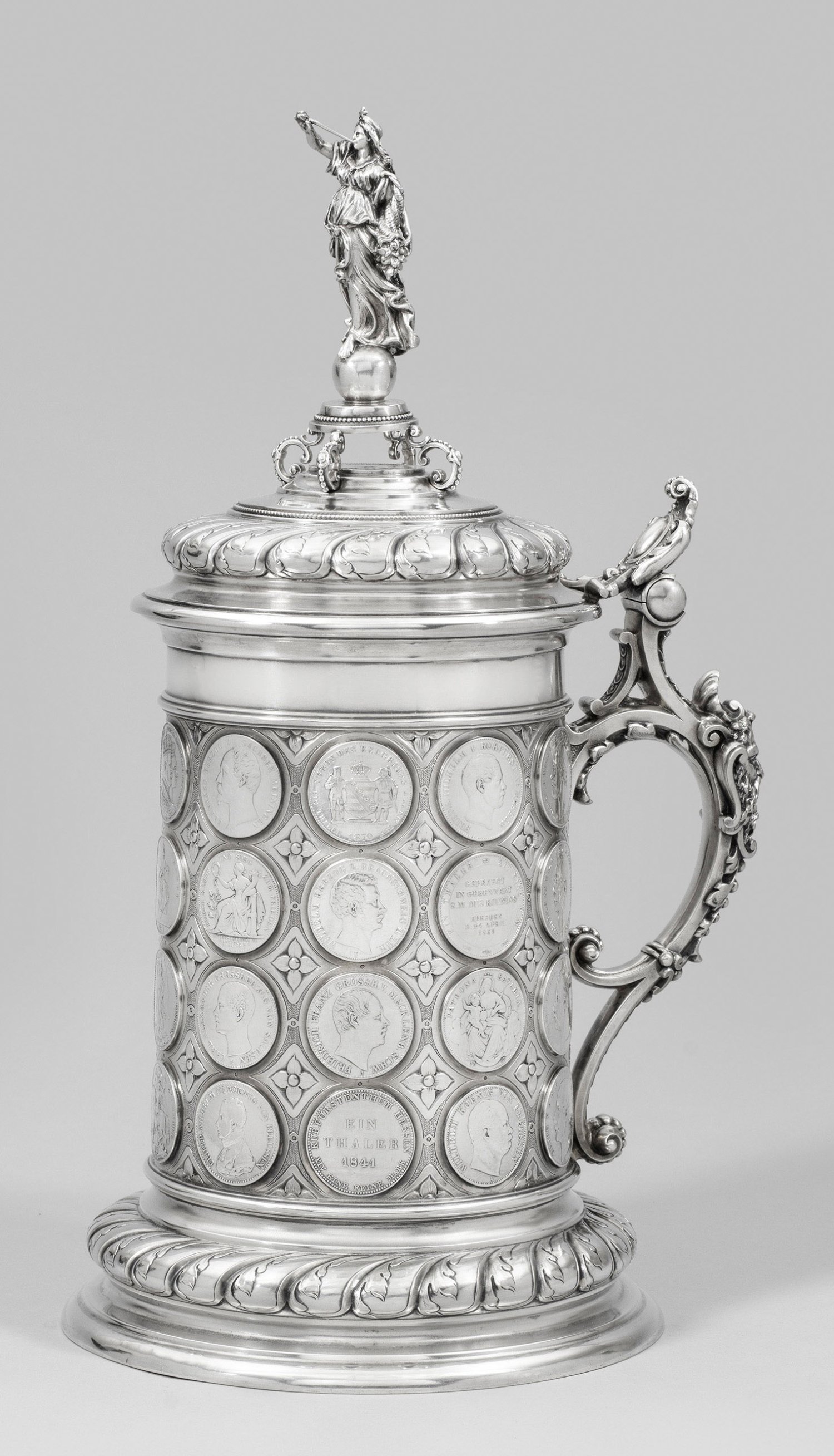 Silber. Ausgestellter, von Godronen und Akanthusblättern umzogener Stand, übergehend in zylindrischen Korpus. Aufgewölbter, korrespondierend gestalteter Scharnierdeckel bekrönt von vollplastischer Darstellung der Göttin Fortuna. Seitlich stark volutierter, mit Maskaron besetzter Henkel. Gerade Wandung dreireihig besetzt mit insges. 40 Münzen des Deutschen Reiches von 1818 bis 1876. Darunter u.a. ein Taler mit König Ernst August von Hannover von 1840, ein Vereinstaler des Fürstentums Schwarzburg-Rudolstadt, ein Frankfurter Vereinstaler von 1864, ein sog. Madonnentaler Bayern König Ludwig II. von 1867 und eine 5-Mark-Münze des Königreichs Preußen mit Kaiser Wilhelm I. von 1876. Unterseitige Widmung "Herrn Karl Marti in dankbarer Erinnerung Lucy Oppenheimer, Nora Allatini, 1918". Innen vergoldet. Gest. 800, Herstellerzeichen, Händlermarke der Gebrüder Friedländer. Gew. ca. 2120 g. H. 40 cm.