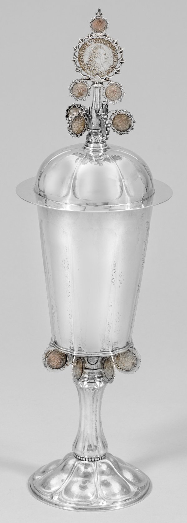 Silber, fein martelliert. Runder, aufsteigender, von dezentem Buckeldekor umzogener Stand, übergehend in schlanken Schaft und konische, hohe Kuppa. Halbrund aufgewölbter Deckel mit breitem, ausgestelltem, glattem Rand. Deckel, Schaft und Kuppa von vertikalen Graten und Rippen gegliedert. Unterhalb der Kuppa als Verlängerung der Rippen sieben zarte, ausgestellte Fassungen mit eingesetztem 1/24 Thaler, 1755 bis 1764. Der Deckel korrespondierend bekrönt von einem großen Schmeck mit fünf ausgestellten, blattförmig gerollten und durchbrochen gearbeiteten Fassungen mit fünf 1/48 Thaler, 1761-1777. Darüber ein großer "Friedericus Borussorum Rex"-Thaler mit Profil von Friedrich II. von Preussen, 1777, gerahmt von drei 3-Gute-Pfennig, 1761 und 1777. Gest. 800. Gew. ca. 1280 g. H. 49,5 cm.