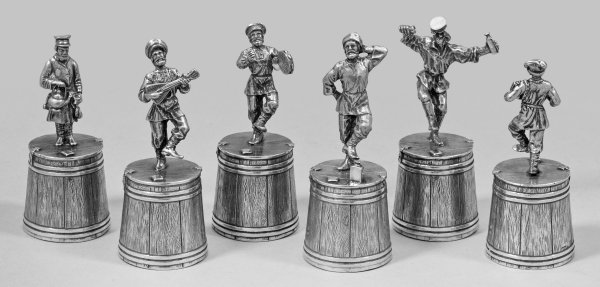 Silber. Auf stilisierten Holzfässern als Kuppa die vollplastischen Darstellungen von teilw. tanzenden und musizierenden Männern. Innen vergoldet. Gest. 84. Gew. zus. ca. 340 g. H. 7,5 cm - 8,5 cm.