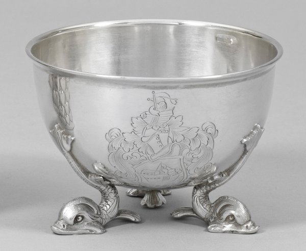 Sterlingsilber. Kugelig gebauchte, glatte Schale mit gering ausgestelltem Lippenrand, getragen von drei vollplastisch gearbeiteten Füßen in Gestalt von Delphinen. Schauseitig graviertes Wappen mit üppiger Helmzier. Gest. 925, Herstellerzeichen, Pseudomarken sowie britische Importmarken für Chester mit Jahresbuchstabe "J" und Händlermarke von B. Muller & Son. Gew. ca. 285 g. H. 9 cm. D. 13,5 cm.