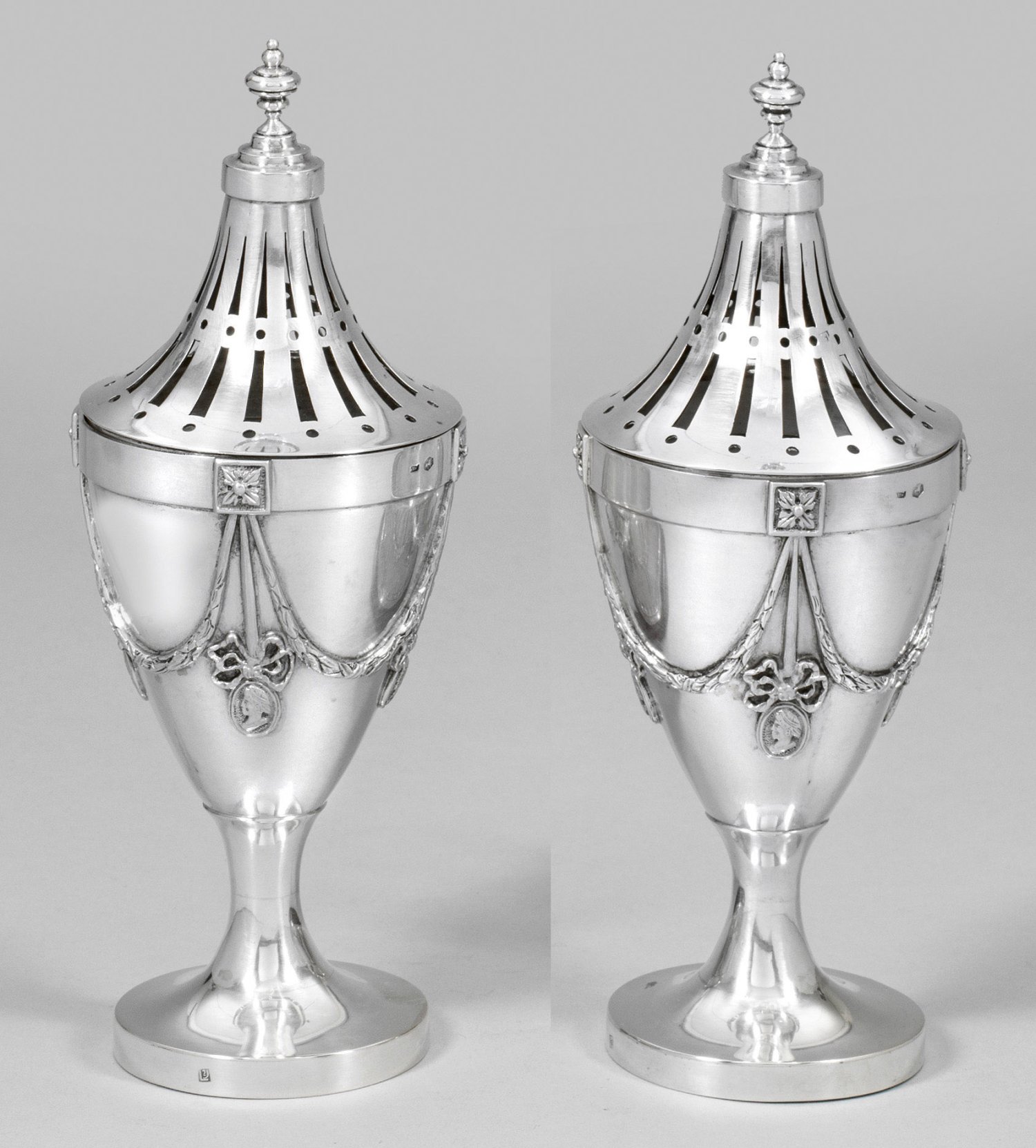 Silber. Trompetenförmiger Stand mit kurzem, eingezogenem Schaft, übergehend in konischen, glatten Korpus. Darauf reliefplastische Blattfestons mit kleinen Porträtmedaillons. Stabförmig durchbrochen gearbeiteter, spitz zulaufender Stülpdeckel, bekrönt von gedrücktem Balusterknauf. Gest., Beschauzeichen, undeutliches Herstellerzeichen, Jahresbuchstabe "E". Gew. zus. ca. 660 g. H. 23 cm.