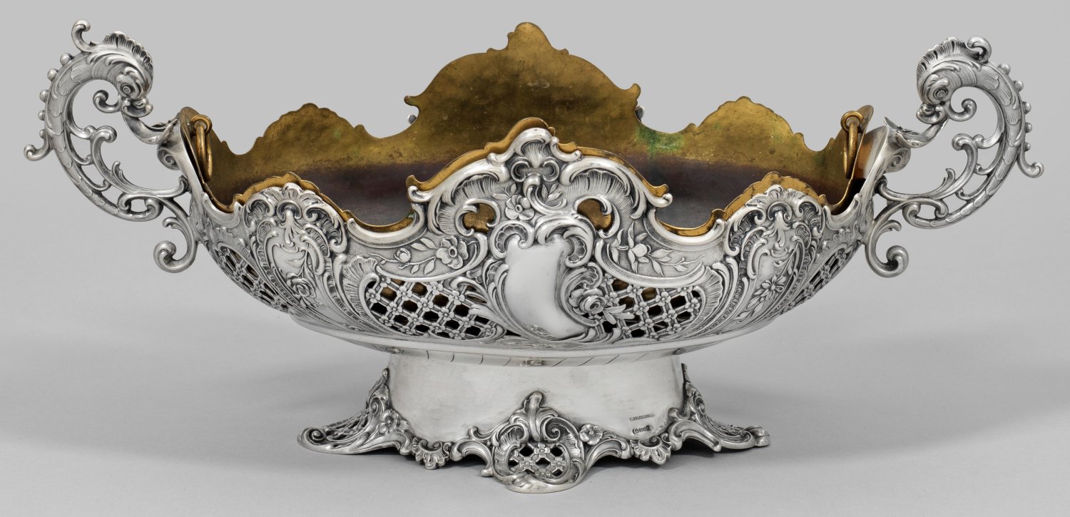 Silber und Messing. Über ovalem, vierfach leicht ausgestelltem Stand schiffchenförmiger Korpus mit passig geschweiftem Rand. Stand und Korpus durchbrochen gearbeitet in Form von üppigem Gitter- und Muschelwerk, C-Schwüngen, Voluten und Blüten. Seitlich je eine hoch aufsteigende Handhabe in Form eines stilisierten Delphins. Innen vergoldet. Passig geschweifter Messingeinsatz mit Ringösen. Gest. 800, Herstellerzeichen, Händlermarke "E. Goldschmidt". Gew. ohne Einsatz ca. 750 g. H. 17 cm. 41,5 cm x 20 cm.