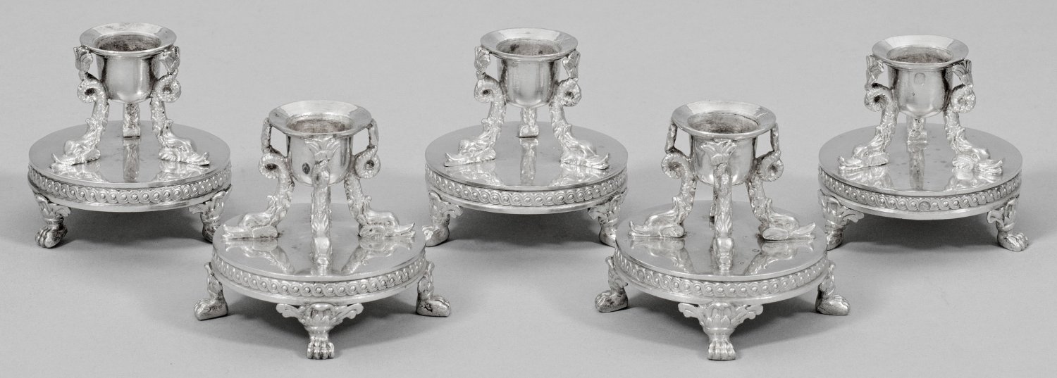 Silber. Über vier Tatzenfüßen ein von zartem Ornamentband gefasster, runder Sockel. Darauf montiert eine von drei vollplastischen Delphinen getragene, glockenförmige Tülle. Gest., Beschauzeichen, Pariser Garantiemarke von 1819-1838. Gew. zus. ca. 395 g. H. 5 cm. D. 5,2 cm.
