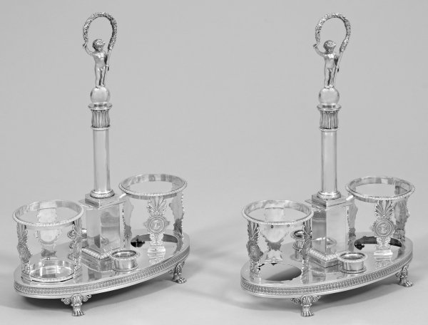 A pair of large French Empire silver menages by Jaques-Gabriel-André Bompart (active since 1789). Glass insets are missing. Assay marks and master´s mark.