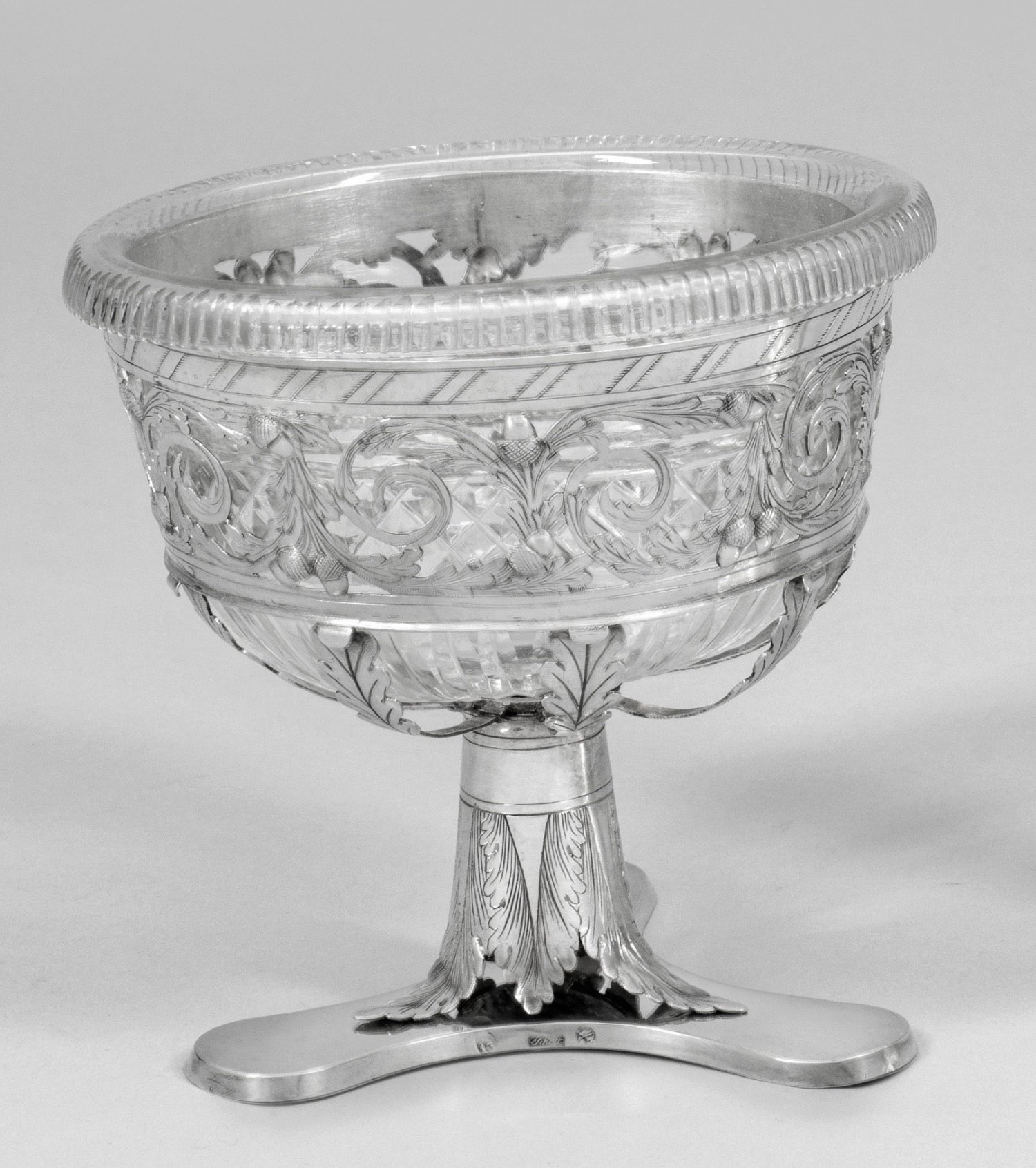 Silber. Über flachem, dreipassigem Stand kurzer, von stilisierten Blättern flankierter Schaft. In Form von Eichenlaubranken durchbrochen gearbeitete, halbrunde Wandung. Facettgeschnittener, farbloser Glaseinsatz. Gest. 13 Lot, Herstellerzeichen. Gew. ca. 355 g. H. 12,5 cm.