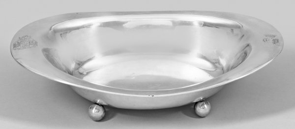 Silber. Über vier großen Kugelfüßen ovale, tief gemuldete, glatte Schale mit sanft nach außen schwingendem Rand. Die Kurzseiten mit verbreitertem Randbereich als Handhaben. Darauf graviert ein detailreiches, von bekrönten Adlern flankiertes und mit üppiger Helmzier dekoriertes Wappen sowie ein Monogramm "EP" jeweils unter Grafenkrone. Gest. 13 Lot, Beschauzeichen mit Dat., Meister Jakob Krautauer (tätig ab ca. 1796), Steuerfreistempel (1809-1810), Wiener Repunzierung (1807-1866). Gew. ca. 1030 g. H. 9,3 cm. 41,8 cm x 26,7 cm.