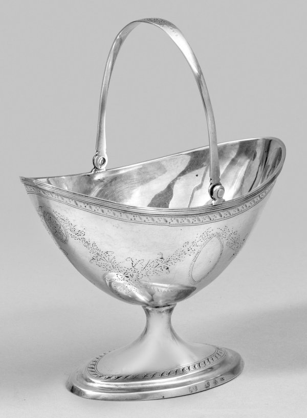 Silber. Über gering gekehltem, hohl gearbeitetem Ovalstand, kurzer eingezogener Schaft und schiffchenförmiger Korpus mit übergreifendem, beweglichem Bandhenkel. Die glatte Wandung unterhalb des schmalen, mehrfach profilierten Lippenrandes mit umlaufend zartem Ornamentband sowie Blütenfestons und Wappenkartuschen graviert. Graviertes, ligiertes Monogramm "CK". Gest., Beschauzeichen, Meister Carl Christoph Karpienski (tätig ab ca. 1794), Jahresbuchstabe "N" (?), Preußischer Steuerstempel. Gew. ca. 215 g. H. 19 cm.