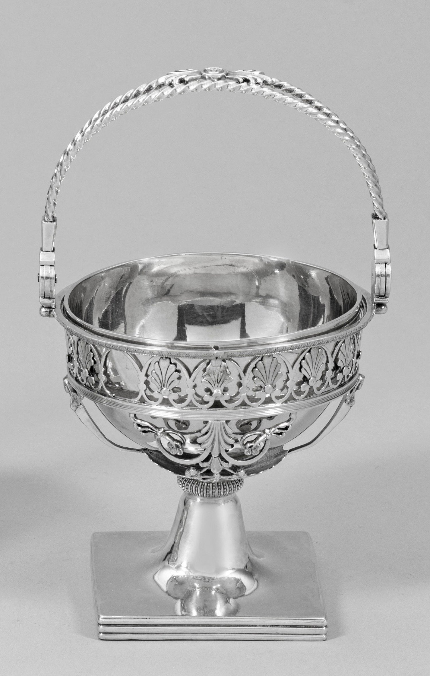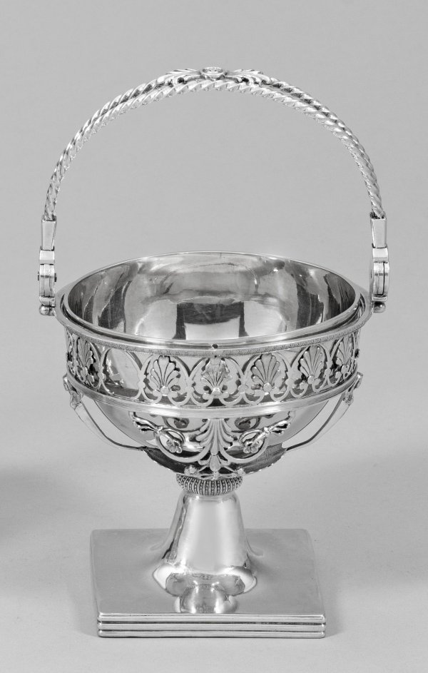 Silber. Quadratische, am Rand von Profillinien umzogene Plinthe, übergehend in kurzen, sich verjüngenden Schaft und halbrunden Korpus. Aus schmalen Streben filigran gestaltete Wandung in Form von durchbrochen gearbeiteten Blatt-, Blüten- und Zierornamenten. Glatte, halbkugelige Silberschale als Einsatz. Scharnierter, übergreifender Henkel aus zwei Kordelbändern. Obenauf ein appliziertes Palmettenblattornament. Minim. besch.; Gest., Beschauzeichen von 1793-1798, Meister Marc Jacquait/Jacquart (tätig seit 1797). Gew. ca. 635 g. H. 23 cm. D. 13 cm.