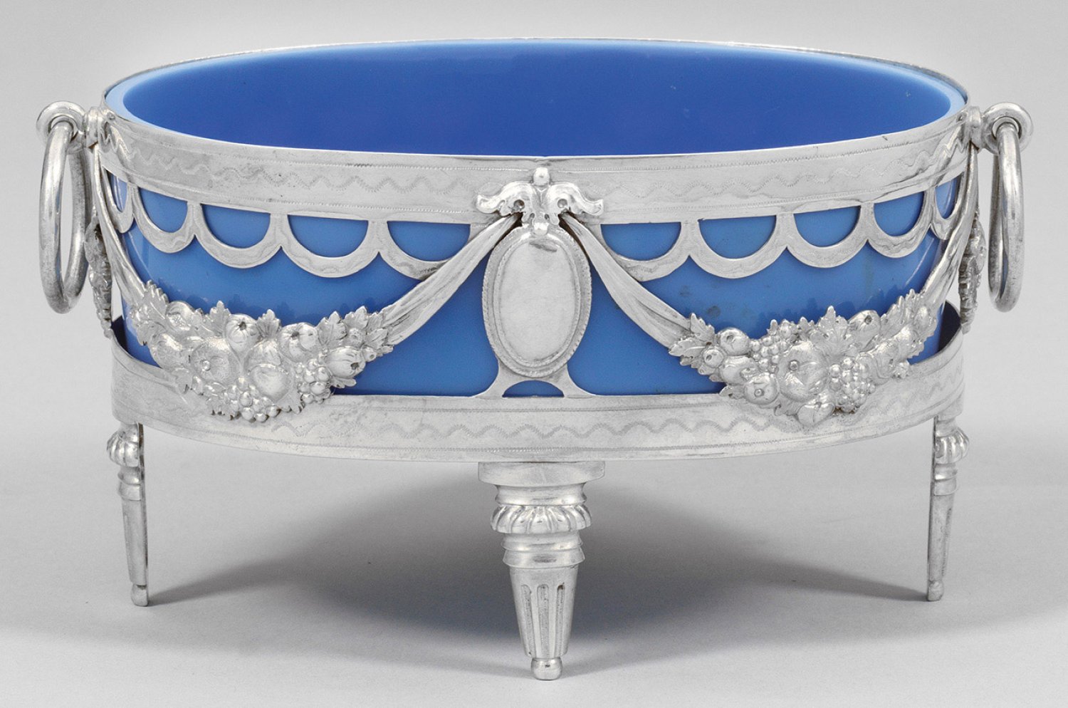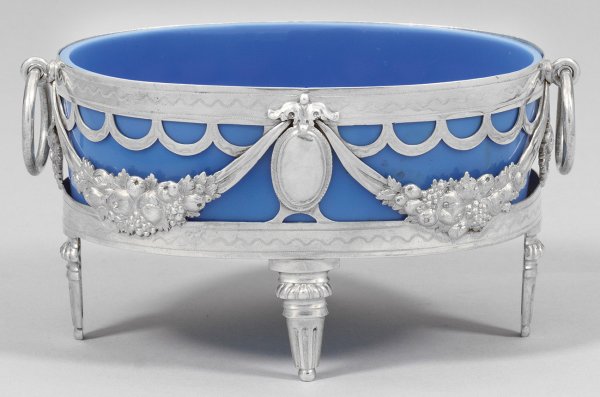 Silber und geschliffenes Opalinglas. Von vier in ovalen Medaillons endenden balusterförmigen Füßen getragener Korpus. Wandung filigran durchbrochen gearbeitet in Form von prächtigen Früchtefestons und wellenförmigen Bändern. Herausnehmbarer Einsatz aus milchig hellblauem Glas. Seitlich zwei bewegliche Ösen als Handhaben. Gest., Beschauzeichen, Meister Philipp Friedrich Bruglocher (wird Meister 1771). Gew. ohne Einsatz ca. 165 g. H. 8,5 cm. 15,5 cm x 9,5 cm.