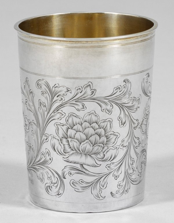 Silber. Sich konisch erweiternder Korpus mit mehrfach profiliertem Lippenrand. Ansatz und Randzone abgesetzt durch schmale Profillinien unterschiedlicher Breite. Wandung umzogen von fein gravierten, fließenden, volutierten Akanthusblattranken, als Rahmung für üppige Barockblüten. Innen vergoldet. Gest., Tremolierstrich, Beschauzeichen, Meister Cornelius Poppe (wird Meister um 1685). Gew. ca. 135 g. H. 9 cm.