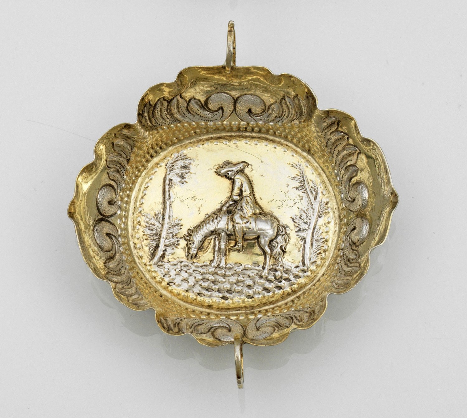 Silber, teilw. vergoldet. Ovale, passig geschweifte Schale. Von üppigem Perl- und Blattfries gerahmter Spiegel mit Darstellung eines Reiters zu Pferde vor bewaldeter Landschaft. Beidseitig schmale Volutenhenkel. Gest., Tremolierstrich, Beschauzeichen, Meister Johannes Kilian (wird Meister vor 1666). Gew. ca. 65 g. 10 cm x 11 cm.