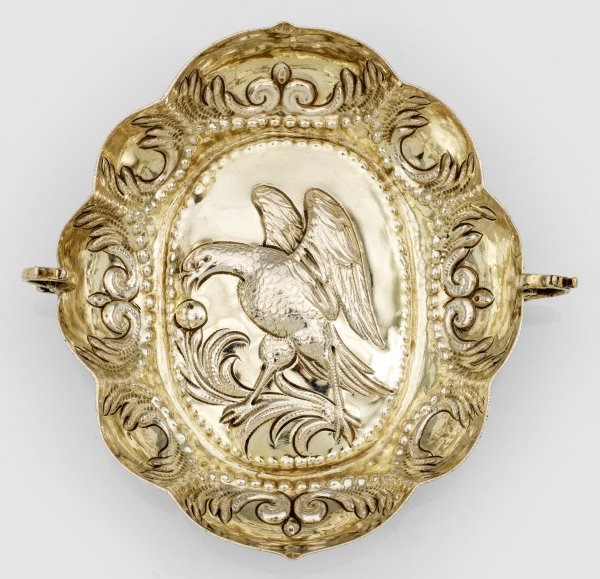 Silber, teilw. vergoldet. Ovale Form mit passig geschweifter Wandung. Gering gewölbter Spiegel mit Darstellung eines großen Raubvogels auf einer Blattranke mit Früchten sitzend. Die Wandung innen umlaufend verziert mit Punkte-, Voluten- und Blattdekor. Seitlich zwei schmale Volutenhenkel. Gest., Tremolierstrich, Beschauzeichen, Meister Balthasar Haydt (wird Meister um 1645). Gew. ca. 100 g. H. 3,5 cm. 13,3 cm x 13,5 cm.