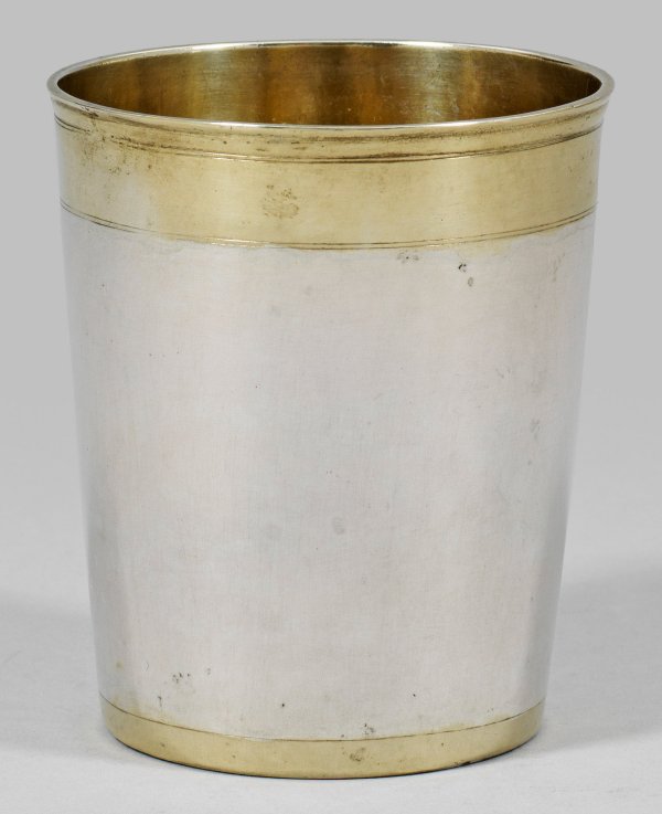 Silber, teilw. vergoldet. Konische Form mit profiliertem, geringfügig ausgestelltem Lippenrand. Glatte Wandung mit Randzonen unterschiedlicher Breite, abgesetzt durch schmale Profillinien. Innen vergoldet. Gest., Tremolierstrich, Beschauzeichen, Meister Philipp Stenglin (wird Meister 1696). Gew. ca. 140 g. H. 9 cm.