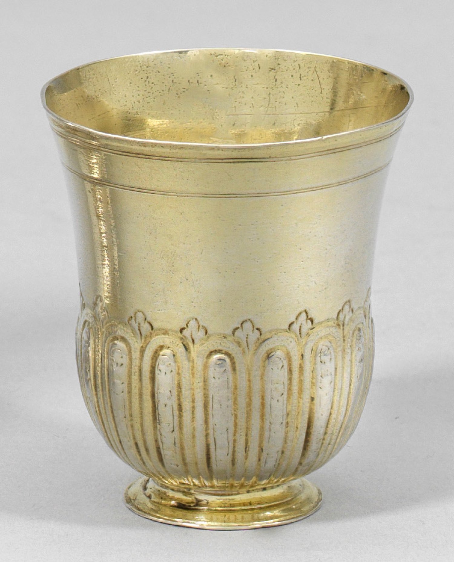 Silber, teilw. vergoldet. Auf flachem, von schmalen Profillinien umzogenem und gekehltem Rundstand hoch aufsteigende, gering ausschwingende, glockenförmige Kuppa. Durch doppelreihig angeordnete Profillinien abgesetzter Lippenrand. Untere Wandungshälfte umzogen von reliefplastisch getriebenem Zungenfries mit fein punziertem, alternierendem Blattdekor verziert und bekrönt von stilisierten, rautenförmigen Blättern. Innen vergoldet. Gest., Tremolierstrich, Beschauzeichen, undeutliche Meistermarke wohl Matthäus II Baur (wird Meister um 1681) sowie Pächterstempel für Paris (1687-1691). Gew. ca. 45 g. H. 5,8 cm.