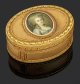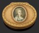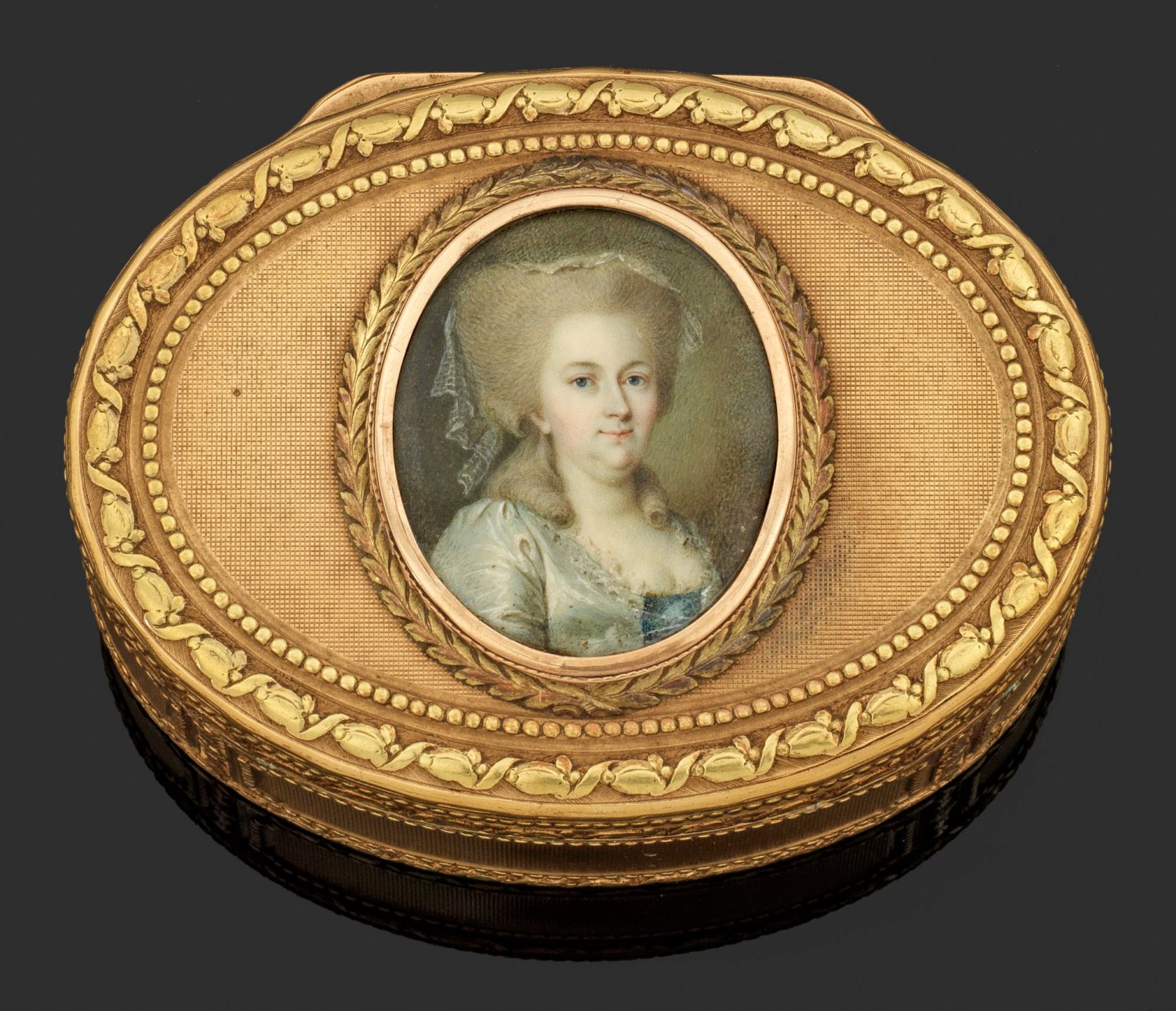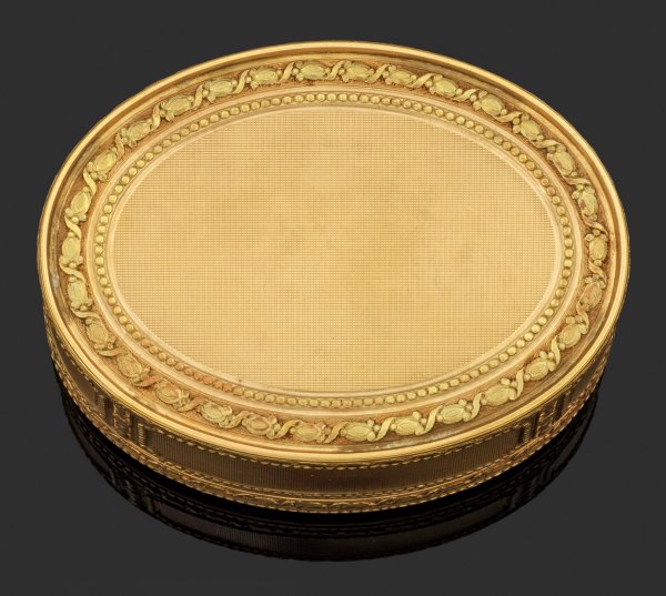 Gelb- und Rotgold. Ovale Form. Boden, Wandung und scharnierter Deckel flächendeckend mit reich guillochierten Netzstrukturen umzogen. Kassettenähnliche Gliederung aus reliefplastischem Perlband- und Blütenkelchdekor. Auf dem Deckel ein hochovales, von stilisiertem Blattkranz gefasstes Miniaturporträt hinter Glas mit dem Brustbildnis einer Rokokodame mit gepudertem, hochtoupiertem Haar und edlem eisgrau- und blaufarbenem Kleid. Temperamalerei auf Elfenbein. Gest. mit Hanauer Prestigemarken in der Art französischer Beschaumarken, wie die des Pariser Pächters Julien Alaterre. Meister wohl Esaias Fernau (tätig ab ca. 1762). Gew. 185 g. H. 3,3 cm. 8,3 cm x 6,2 cm. CITES-Bescheinigung liegt vor.