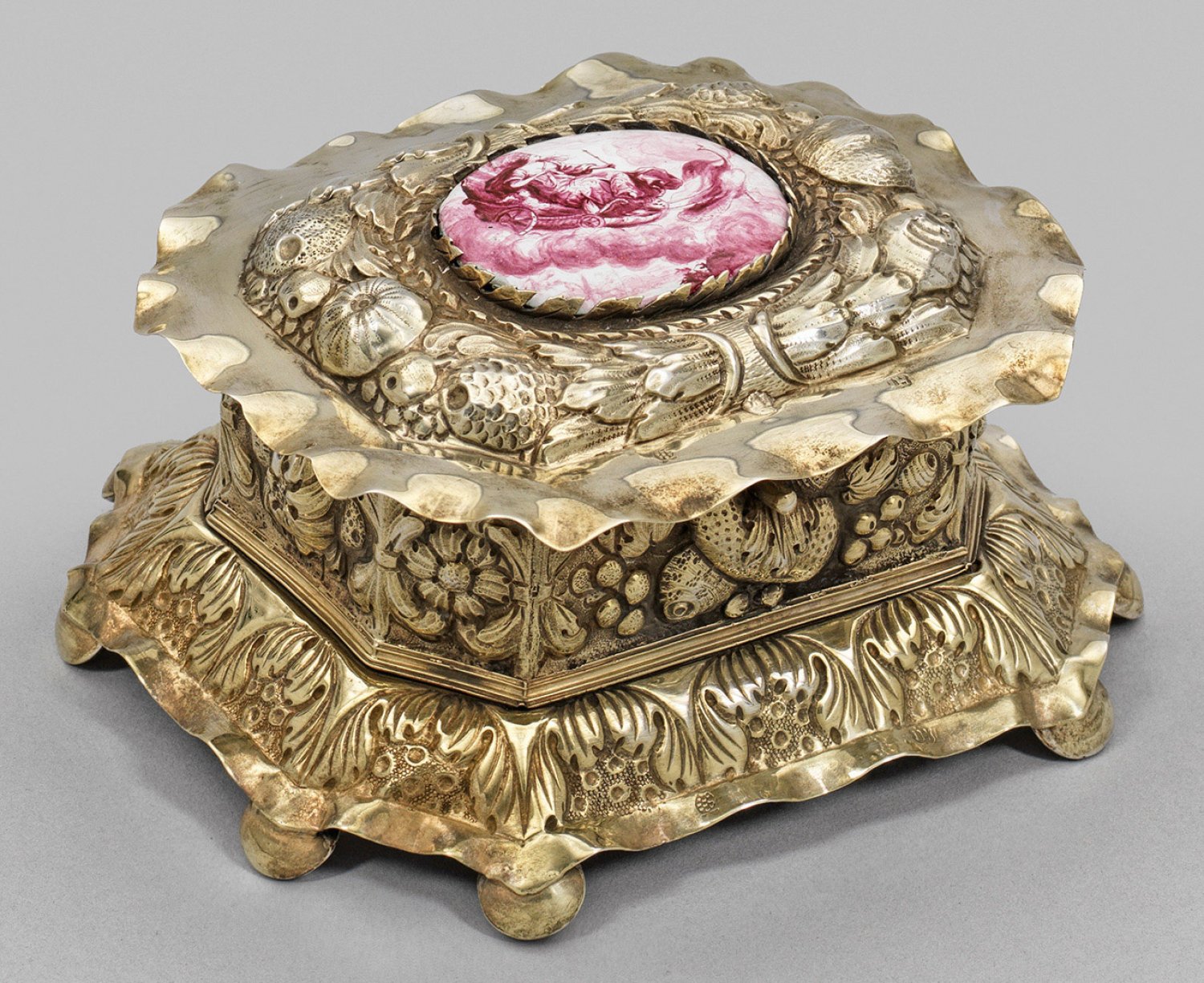 Silber, voll vergoldet. Über acht ellipsenförmigen Füßen weit ausgestellter, wellenförmig gebogter Sockel mit punziertem und getriebenem Blattfries. Darüber ein achtkantiger, am Rand profilierter Korpus mit reliefplastisch gearbeitetem, üppigem Früchte-, Blüten- und Volutendekor. Weit überstehender, gewölbter und scharnierter Deckel mit glattem, wellenförmigem Rand. Mittig auf dem Deckel ein von Blättern eingefasstes Emailmedaillon, umgeben von reliefplastisch gestaltetem Kranz aus Blattranken und Früchten. Auf dem Medaillon, in feiner, purpurfarbener Emailmalerei vor weißem Hintergrund die Darstellung der römischen Göttin Juno über den Wolken, in einem von Pfauen gezogenen Muschelwagen sitzend. Gest., Tremolierstrich, Beschauzeichen, Meister Johann Haltenwanger (wird Meister 1684). Gew. ca. 225 g. H. 7 cm. 13,5 cm x 11,5 cm.