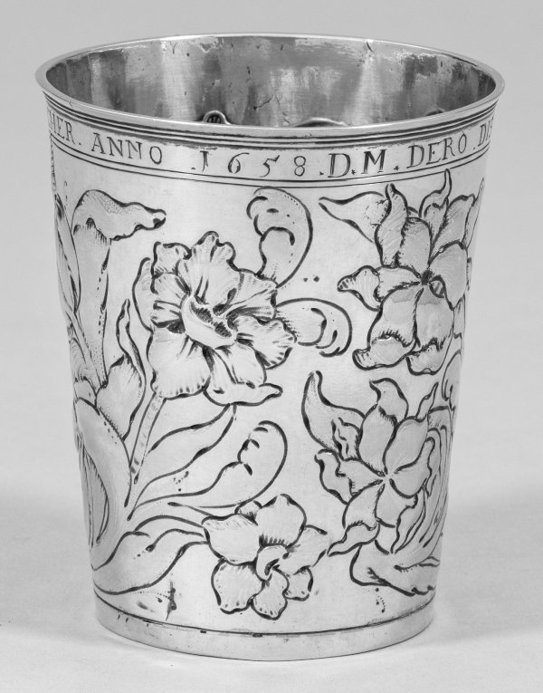 Silber. Konischer Korpus mit schmalem Lippenrand und durch schmale Profillinien abgesetzte Randzonen. Glatte Wandung umzogen von reliefplastisch getriebenen und gravierten Barockblumen und Blättern. Unterhalb des Lippenrandes umlaufend gravierte und dat. Widmungsinschrift "D.M. DERO DISCHLER VND LADEMACHER DRINC GESCHER ANNO 1658". Auf Bodenunterseite gravierte Freimaurersymbole Zirkel und Winkelmaß. Gew. ca. 125 g. H. 12 cm.