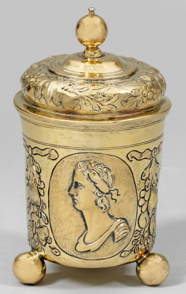 Silber, voll vergoldet. Von drei ausgestellten Kugelfüßen getragener, gering konischer Korpus mit profiliertem Lippenrand. Glatte Randzone abgesetzt durch schmale Profillinien unterschiedlicher Breite. Wandung verziert mit üppigen Fruchtbündeln und Schleifen zwischen drei hochovalen Medaillons mit getriebenen Porträtdarstellungen über fein punziertem Grund. Korrespondierend von reliefplastischen Früchten umzogener Deckel mit hohem, kugeligem Balusterknauf. Bodenunterseite mit gravierten Zunftsymbolen, dat. "1710" sowie monogr. "J.H.St." und "G.W.A.". Gest., Tremolierstrich, Beschauzeichen, Meister Sigmund Bierfreund (wird Meister 1654). Gew. ca. 225 g. H. 16,5 cm.