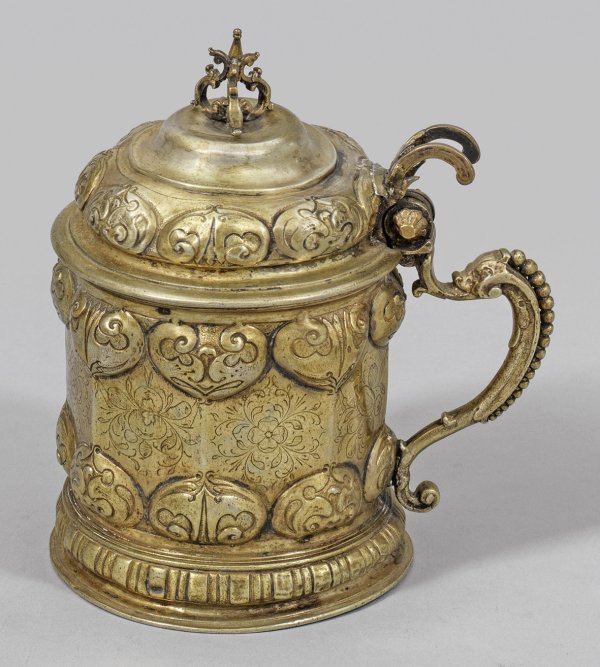Silber, voll vergoldet. Über flacher Stellfläche leicht gewölbter, von einem Stabfries gerahmter Stand. Hoher Korpus, achtfach facettiert. Auf der Wandungsmitte sehr fein gravierte Darstellungen unterschiedlicher Blüten, gefasst von zwei Reihen reliefplastisch getriebener Buckel mit Ohrmuscheldekor in Form von stilisierten Herzen. Aufgewölbter, der Wandung entsprechend gebuckelter Deckel, bekrönt von Volutenknauf. Schmaler Volutengriff mit Perldekor, in geteilter Daumenrast endend. Minim. rest.; Gest., Beschauzeichen, Meister Nicolaus Weiß (wird Meister 1613). Gew. ca. 375 g. H. 15 cm.