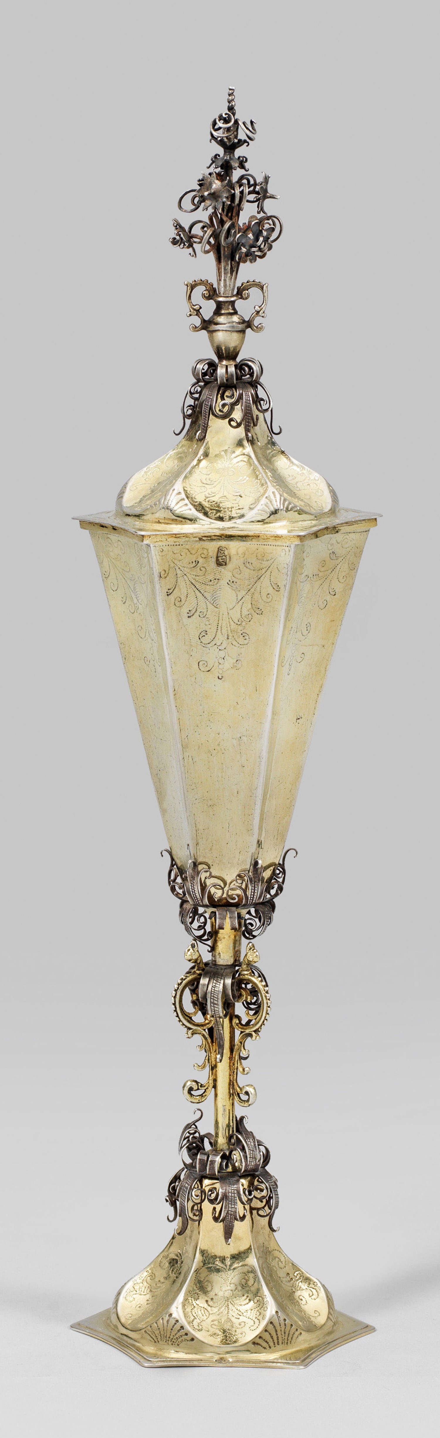 Silber, teilw. vergoldet. Flacher, sechsfach gekanteter und profilierter Stand, mittig aufgewölbt ansteigend und umzogen von konkavem, breitem Zungenfriesdekor. Darüber ein schmaler Schaft, am Ansatz und Übergang zur Kuppa von geschnittenen und gerollten Silberfäden gefasst sowie verziert mit drei volutierten, durchbrochen gearbeiteten, c-förmigen Spangen. Sich konisch erweiternde, hohe, trichterförmige Kuppa. Die Wandung sechsfach gekantet und sternförmig eingezogen. Der Randbereich umzogen von fein punzierten Blattranken. Auf dem Steckdeckel eine zentrale Bekrönung in Form eines vasenförmigen Balusterknaufs mit daraus emporsteigenden, phantasievoll gearbeiteten Blüten und teilw. spiralförmigen Blättern, sog. Schmeck. Stand und Deckel umlaufend korrespondierend verziert mit punzierten, stilisierten Blütenbuketts und Blattranken. Innen vergoldet. Gest., Tremolierstrich, Beschauzeichen, Meister Stephan Gressel (wird Meister 1602), Preußischer Steuerstempel seit 1809. Gew. ca. 310 g. H. 37,5 cm.