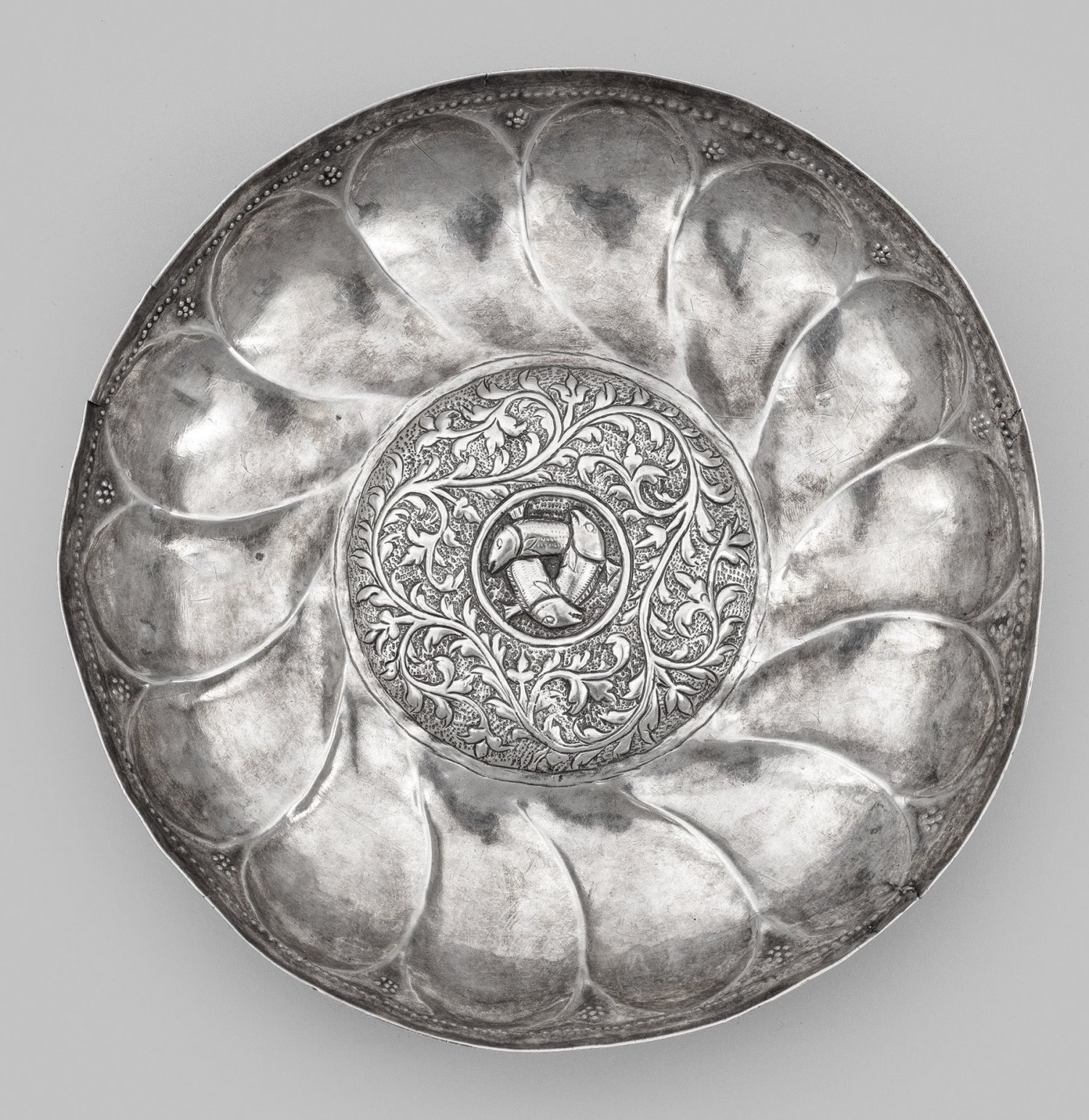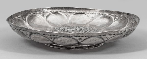 sog. Omphalos-Schüssel. Silber. Flacher, zylindrischer, von horizontalen Linien umzogener Stand. Gering gemuldete, weit ausschwingende Schale. Die Wandung umlaufend mit breitem, rotierendem Fischblasendekor verziert, in glatter Randzone mit einreihig punziertem Perlband über stilisierten Blüten aus siebenfach punziertem und passig angeordnetem Punktedekor. Aufgewölbter runder, von zwei zarten Zierlinien gerahmter Spiegel, sog. Nabel. Über punziertem Grund dreipassig geschweifte, reliefplastisch getriebene Blattranke, als Rahmung für zentrales Rundmedaillon mit drei ineinander verschlungenen Fischen. Ungest.; Gew. ca. 280 g. H. 4 cm. D. 21 cm.