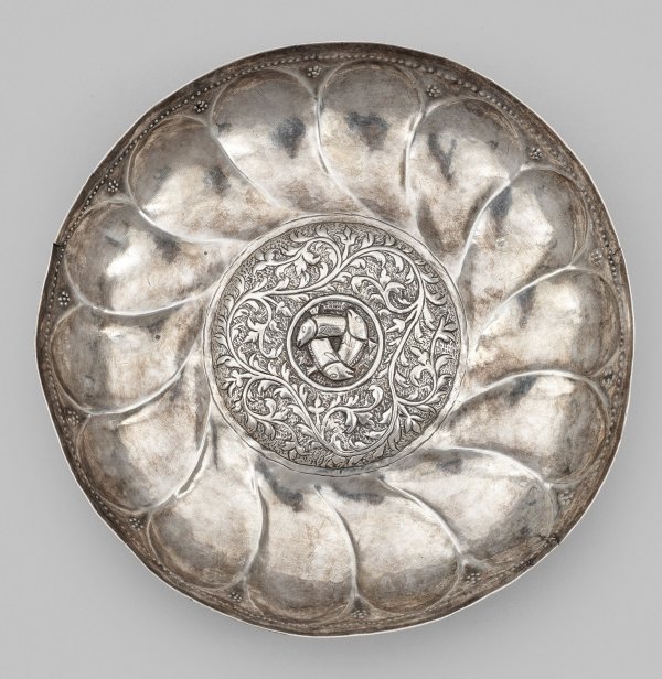 Bereits seit der Antike gab es die römische "Patera" sowie die griechische "Phiale". Dabei handelt es sich um ebensolche flache, runde Schalen, zentral verziert mit einem aufgewölbtem Nabel (griech. "omphalos"). Sie dienten ursprünglich als Opferschalen oder zur Reinigung, wurden jedoch später auch als Trinkschalen verwendet. Die drei ineinander verschlungenen Fische in der Schalenmitte verweisen auf ein frühchristliches Symbol der Dreifaltigkeit, als Einheit von Gott Vater, dem Sohn Jesus Christus und dem Heiligen Geist. Der sog. Fischblasendekor kam vermutlich aus dem asiatischen oder persischen Raum über die Handelswege nach Europa. Insbesondere in Venedig der florierenden Handelsstadt, trafen die unterschiedlichen kulturellen Einflüsse zusammen und machten die Hafenstadt berühmt für die Herstellung außergewöhnlicher und bedeutender Kunstobjekte. Silberschalen dieser Art sind typisch für die Zeit der Spätgotik. Im 16. Jh. wurden sie in ähnlicher Weise aber zumeist aus Kupfer oder Messing wie z. B. die sog. Beckenschlägerschüsseln aus Nürnberg gefertigt.