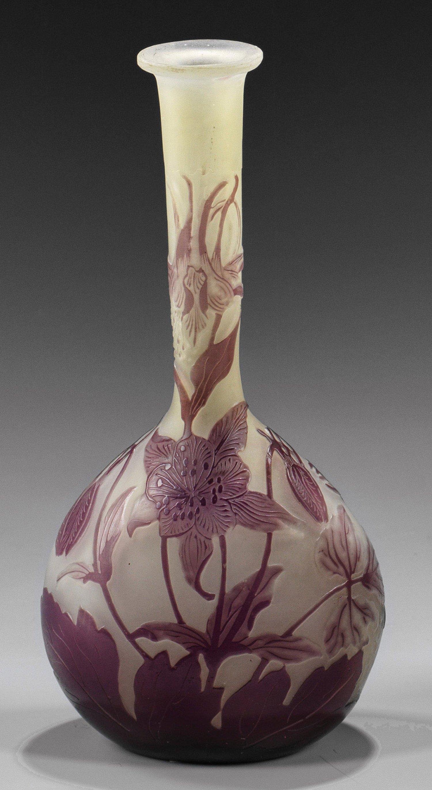 Beidseitig abgeflachter, runder Korpus, langer Röhren-Enghals, leicht ausschwingende Mündung. Überfangglas, farblos, weißlich-cremefarben, gelb und violett. Geätzter Dekor aus blühenden Akeleistängeln. Sign. Gallé. H. 17 cm.