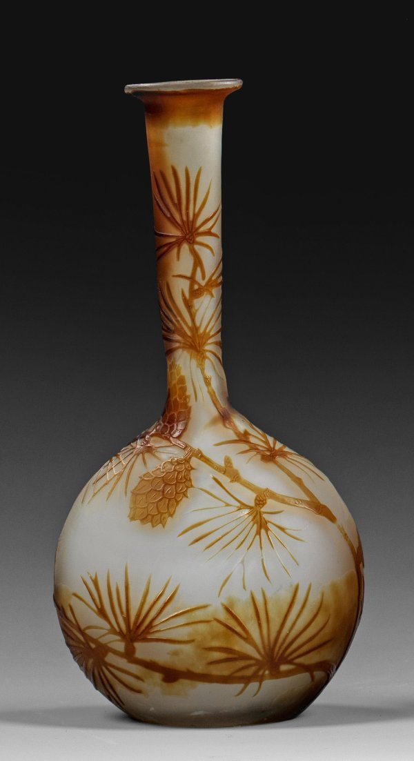 A French cameo glass vase by Gallé with acid-etched decor of larch branches. Signed with star.