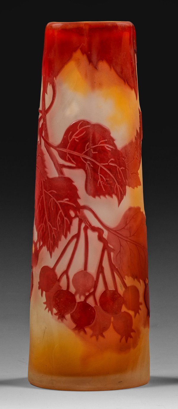 Schlanke, konische, oberhalb vierseitig abgeplattete Form mit vier vertikalen Kerben bis zur Korpusmitte. Überfangglas, farblos, gelb und rot. Geätzter, polierter Dekor. Sign. Gallé mit Stern. H. 20,4 cm.