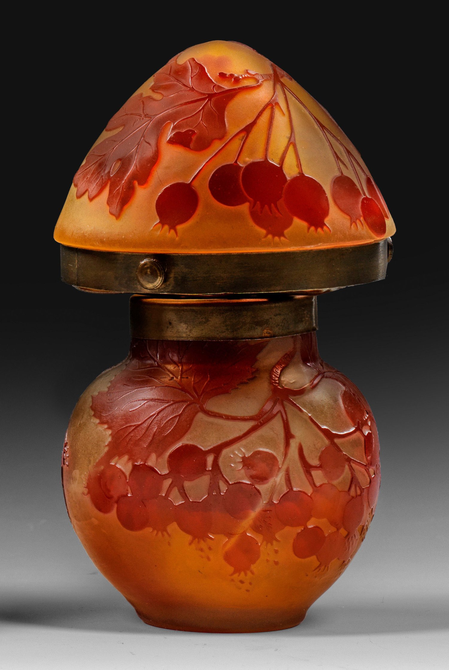 2-flg.; Korpus in leicht ins Oval gedrückter Kugelform, pilzförmiger Schirm. Überfangglas, farblos, gelb und rot. Geätzter, polierter Dekor. Sign. Gallé mit Stern. Messingmontierung für zwei gegenüber liegenden Fassungen zur Beleuchtung des Korpus und Schirms. Elektrifiziert. H. 16 cm.