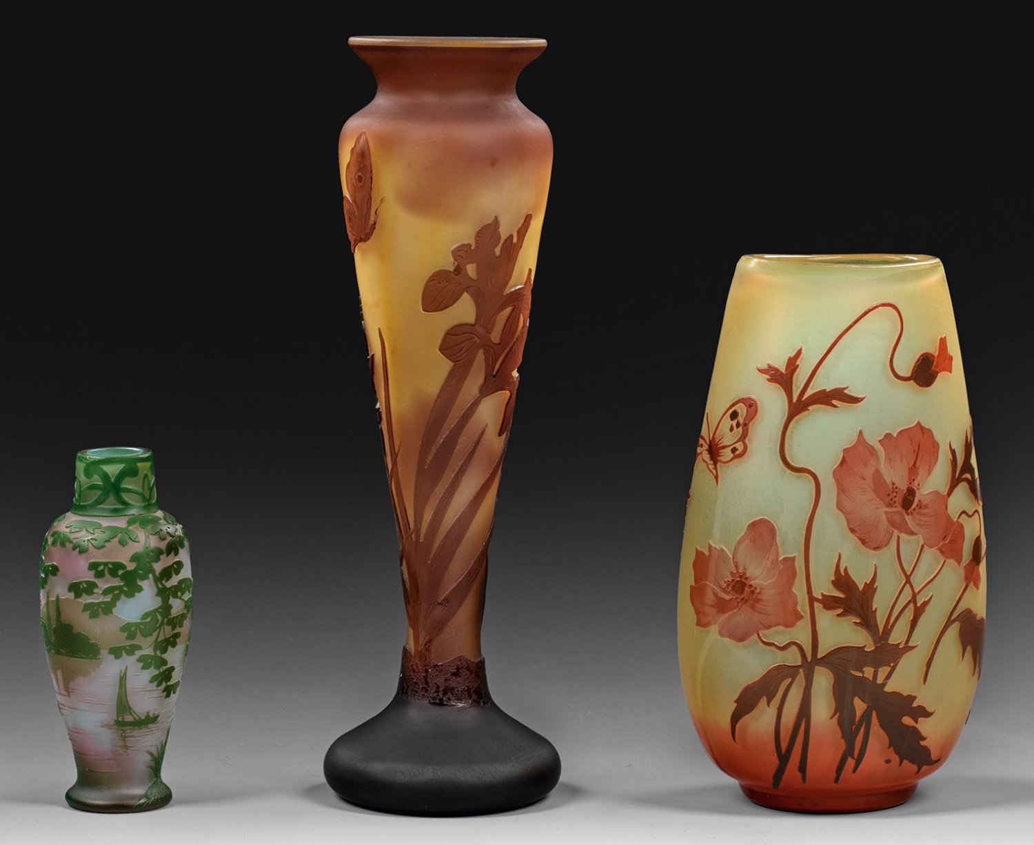 Überfangglas, geätzte Dekore. Eine Vase mit Klatschmohn- und Schmetterlingsdekor, bez. "Les Coquelicots", aus der Cristallerie de Pantin; eine Vase mit Landschaftsdekor, Entw. Camille Tutré de Varreux, bez. "de Vez", Ausführung Cristallerie de Pantin; eine zeitgenössische Vase mit Schwertlilien- und Schmetterlingsdekor. H. 13 cm-29 cm.