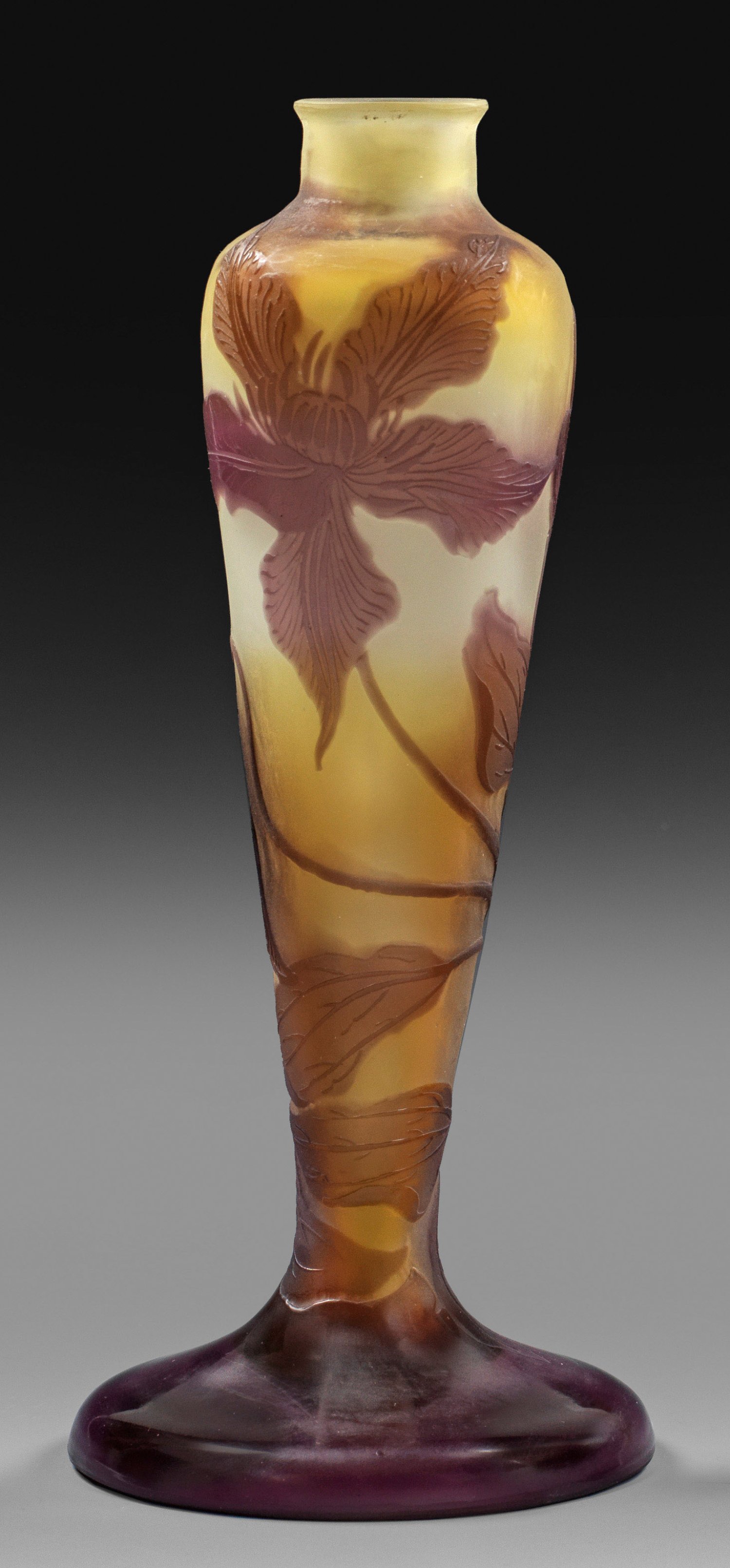 Keulenform auf weit ausgestelltem, massivem Fuß. Überfangglas, farblos, gelb und und violett. In mehreren Arbeitsgängen ausgeführter, geätzter und polierter Dekor. Zweifache Sign. Gallé, einmal hochgeätzt mit Stern. H. 25 cm.