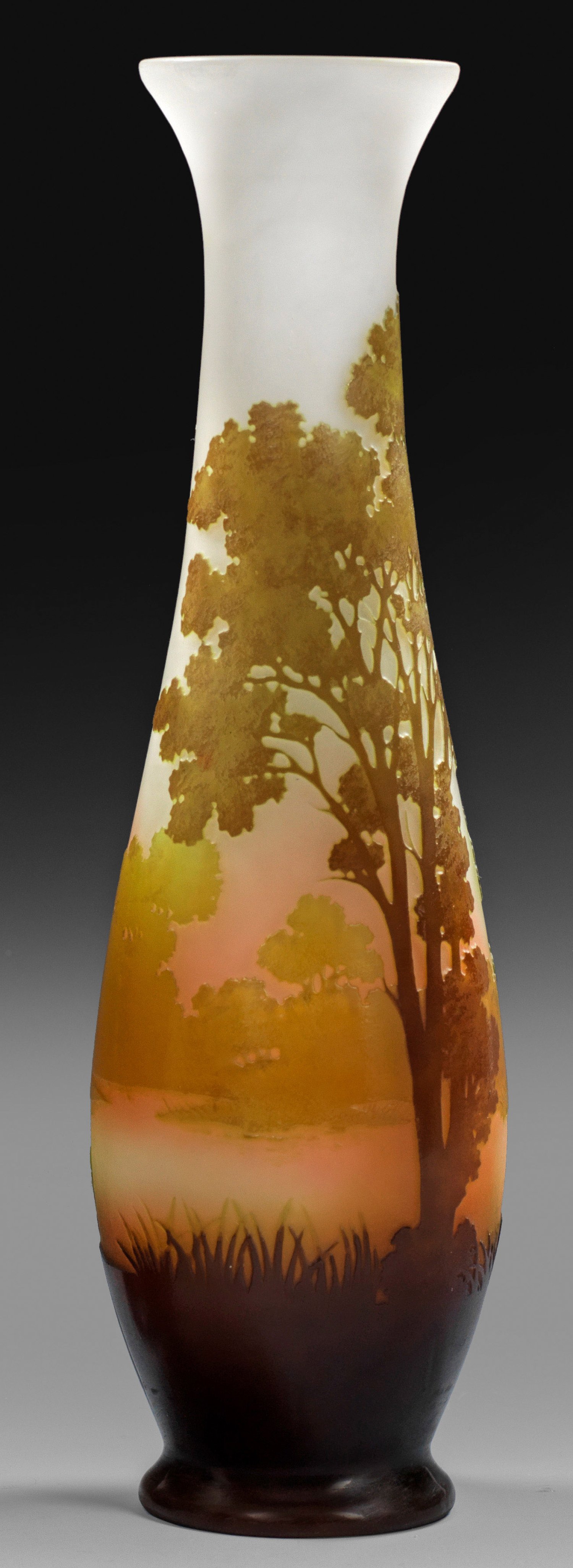 Schlanke Balusterform. Überfangglas, farblos, apricotfarben, hellgrün und dunkelbraun. Umlaufend geätzter, polierter Dekor aus einer baumbestandenen Auenlandschaft im Abendlicht. Sign. Gallé. H. 30 cm.
