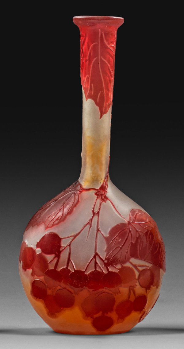 Runder, beidseitig abgeplatteter, sich verjüngender Korpus mit langem, röhrenförmigem Enghals, leicht trompetenartig ausschwingender Lippenrand. Überfangglas, farblos, gelb und rot. Geätzter, polierter Dekor. Sign. Gallé. H. 16,5 cm.