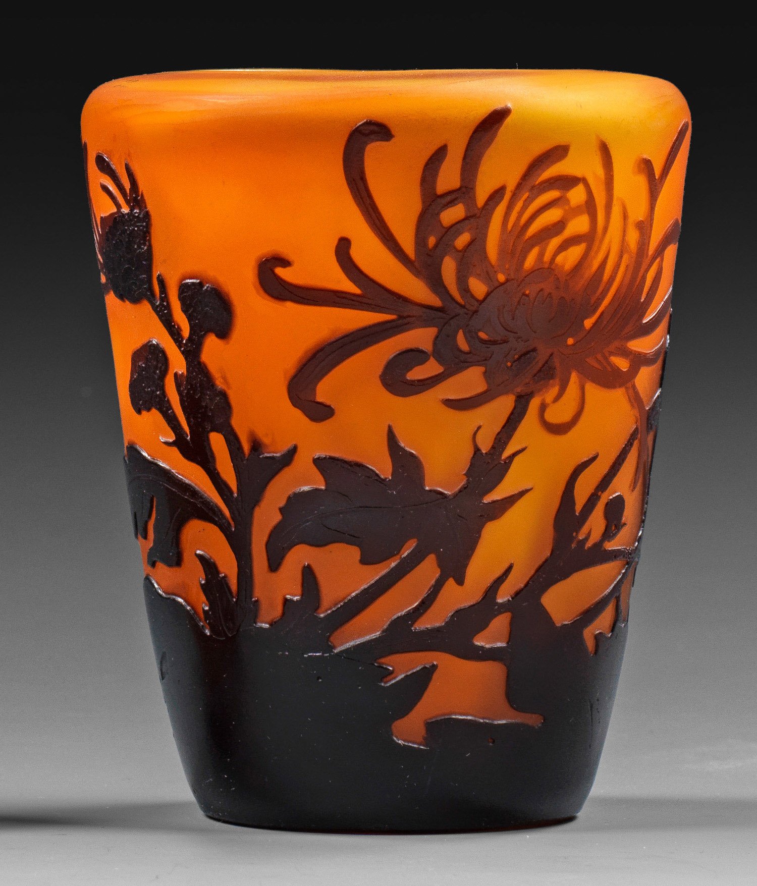 A French cameo glass vase by Gallé with acid-etched chrysanthemum decor. Signed.