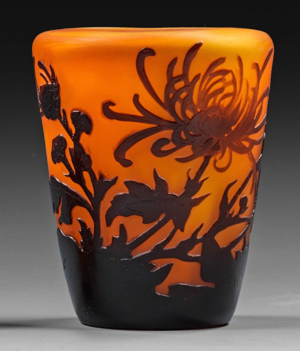 Konische Becherform mit waagerecht eingezogenem Lippenrand. Überfangglas, farblos, orangefarben, opalisierend sowie dunkelviolett (oder dunkelbraun). Geätzter, polierter Dekor. Sign. Gallé. H. 11,5 cm.