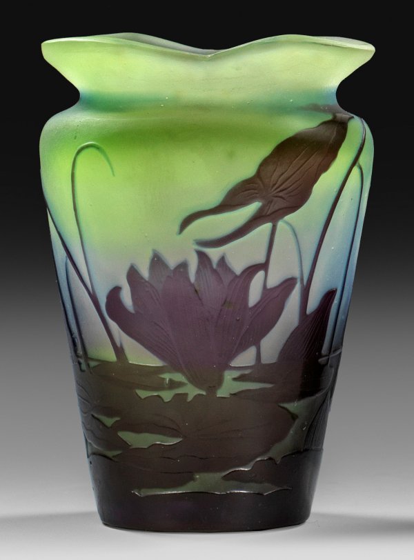 Ins Oval gdrückte Form mit zweipassig ausgezogenem Lippenrand. Überfangglas, farblos, hellgrün und violett. In mehreren Arbeitsgängen ausgeführter, geätzter und polierter Dekor aus einer Teichlandschaft mit See- bzw. Teichrosen, Pfeilkraut und Binsen. Sign. Gallé. H. 13 cm.