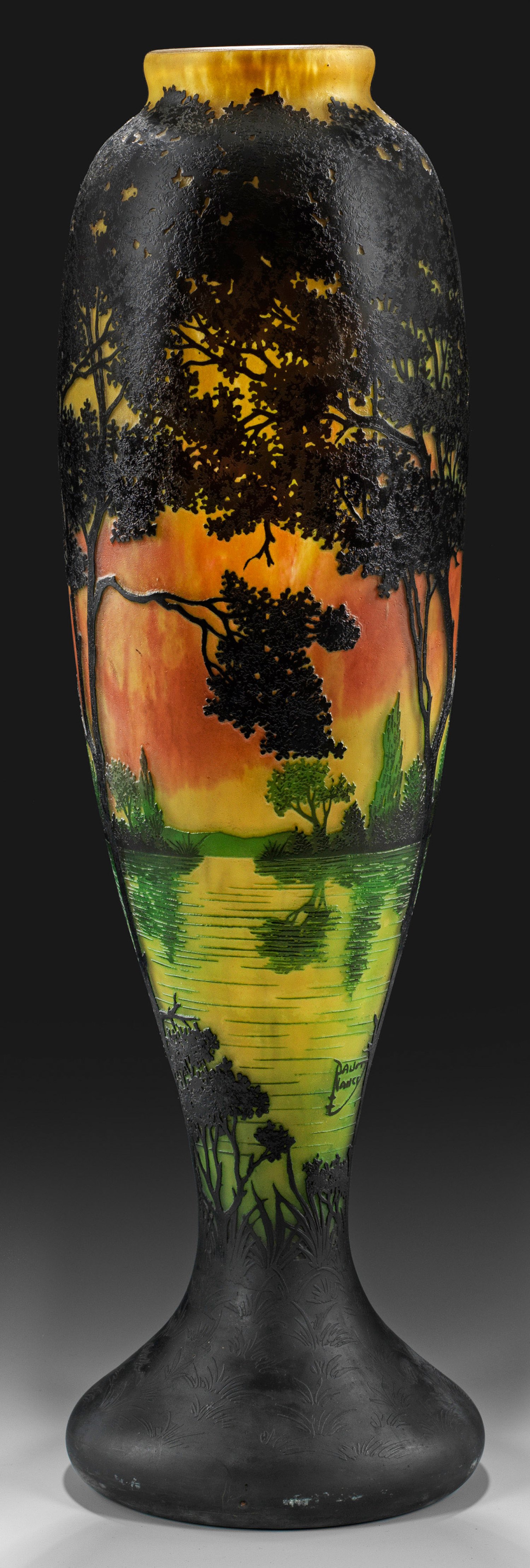 Keulenform mit ausgestelltem Fuß. Überfangglas, farblos mit gelben und roten Pulvereinschmelzungen, grüner und annähernd schwarzer, dunkler Überfang. Geätzter Dekor aus einer baumbestandenen Uferlandschaft eines Flusses oder Sees im Abendlicht. Sign. "DAUM NANCY" verbunden mit Lothringer Kreuz. H. 63,5 cm.