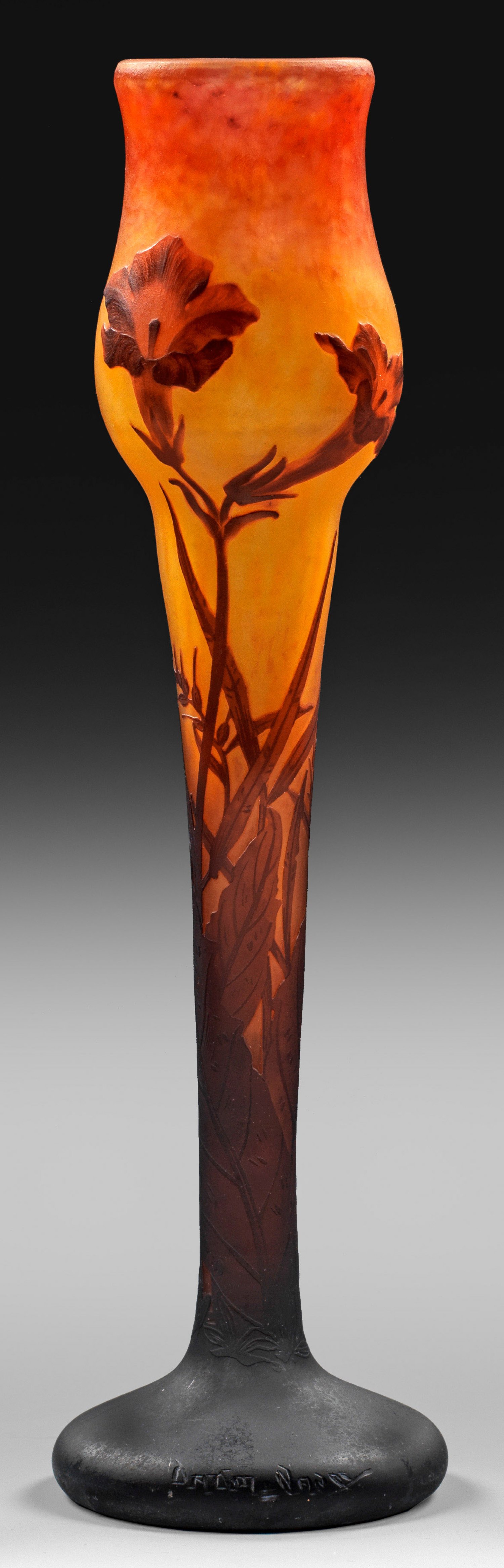 Die Form der Blütenknospen aufgreifende Vase mit weit ausgestelltem Fuß. Überfangglas, farblos mit bernsteingelben Pulvereinschmelzungen, außen dunkelrot und violett überfangen. Umlaufender in mehreren Arbeitsgängen geätzter Dekor, Blüten und Knospen in feinem Hochschnitt modelliert, Binnenzeichnung in flacher Hochätzung. Sign. "DAUM NANCY" mit Lothringer Kreuz. Auf der Bodenunterseite mit Farb- bzw. Wachsstift geschriebene Nr. 49887. H. 31,2 cm.