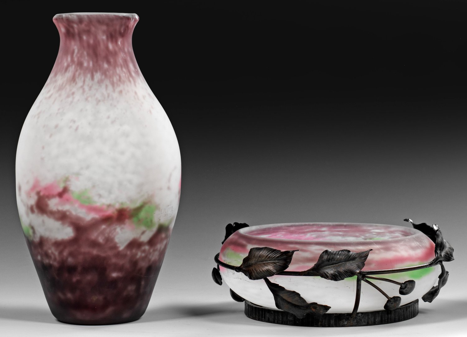 Überfangglas, farblos sowie mit dunkelvioletten, rosafarbenen und hellgrünen Pulvereinschmelzungen. Die Schale in schmiedeeiserner Montierung aus stilisierten Kirschzweigen. Lippenrand der Vase minim. besch.; Sign.; Schalen-D. 20 cm; Vasen-H. 28 cm.