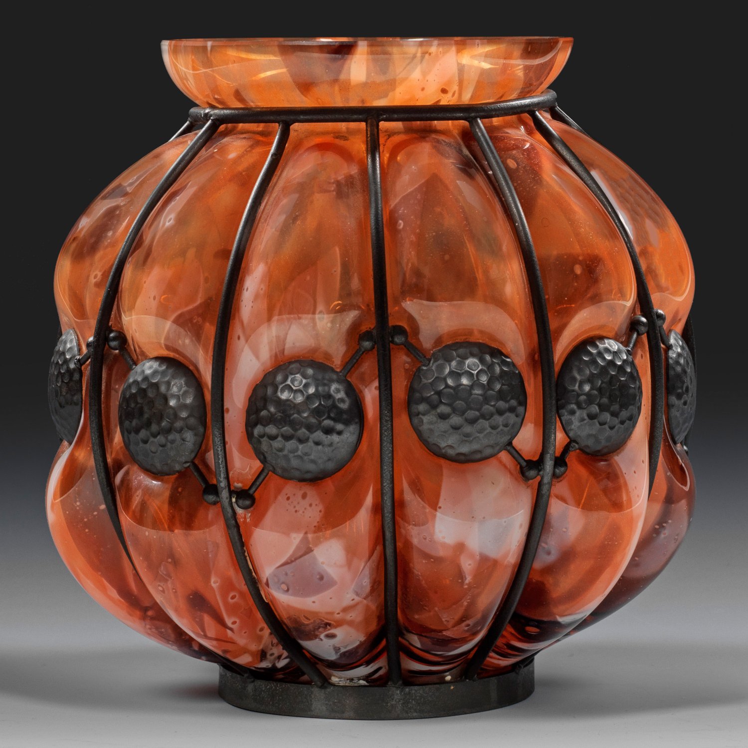 Schmiedeeiserne Montierung. Überfangglas, farblos, hell- und dunkelziegelrote sowie weiße, gefleckte Einschmelzungen in eine gerippte, schmiedeeiserne Montierung mit ornamentalen Beerenmotiven geblasen. H. 27,5 cm.