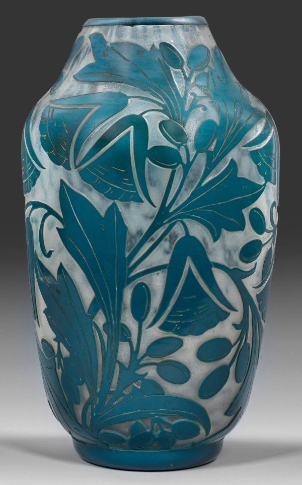 Gestreckt-ovoide Form mit konisch hochgezogener Mündung. Überfangglas, farblos mit weißlichen Pulvereinschmelzungen und türkisblauer Deckschicht. Flächendeckender, seltener Dekor "Fleurs stylisées" aus stilisierten Zweigen bzw. Stängeln mit Früchten und Blüten vor eisglasartig rauem Grund, geätzt. Sign. "DAUM NANCY FRANCE" mit Lothringer Kreuz. H. 31,5 cm.