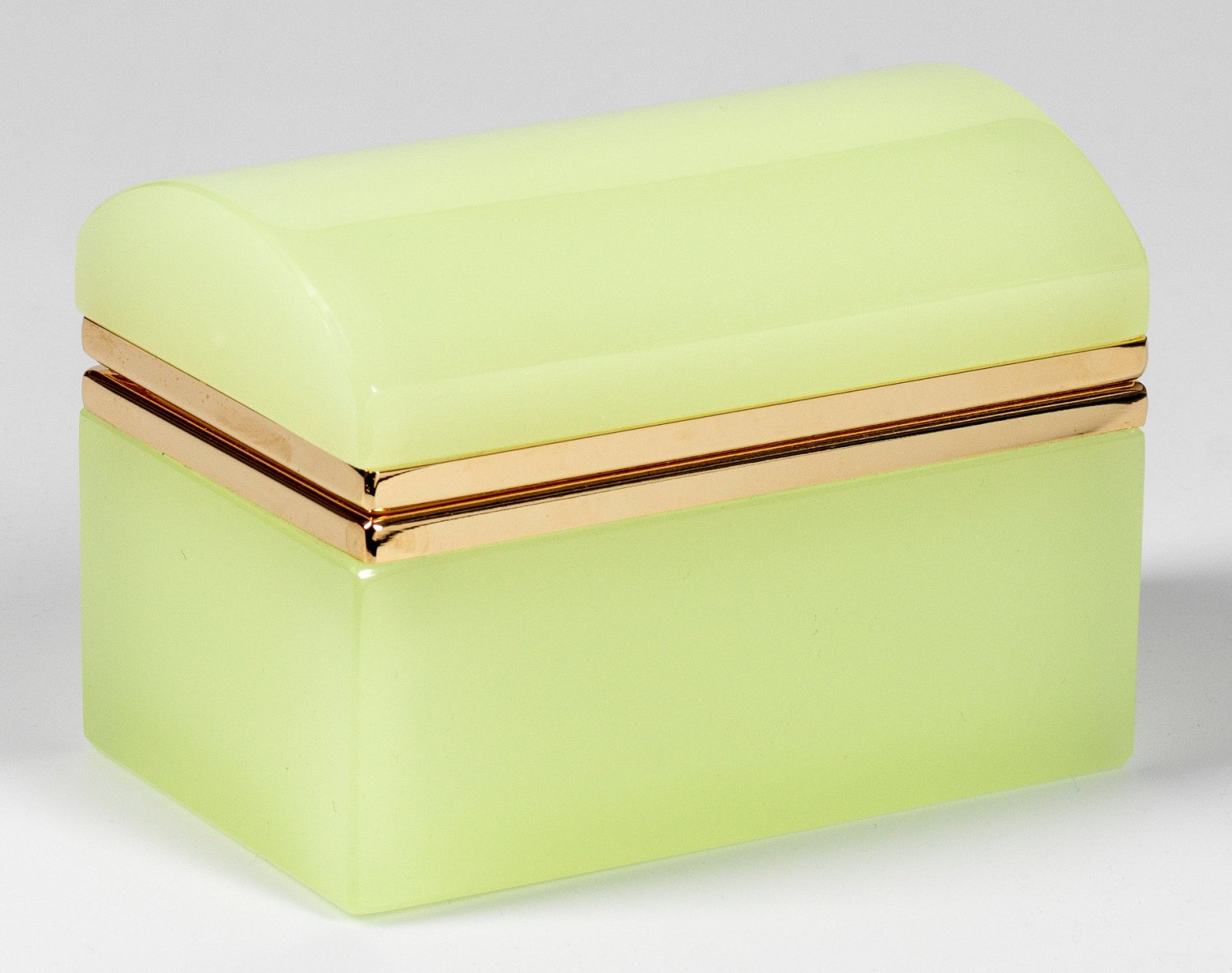 Rechteckige Truhenform mit Runddeckel. Geschliffenes und poliertes, limonengrünes bzw. limettengrünes, opakes Glas. Scharnierte Messingmontierung. H. 9,8 cm, 13,5 cm x 8,5 cm.